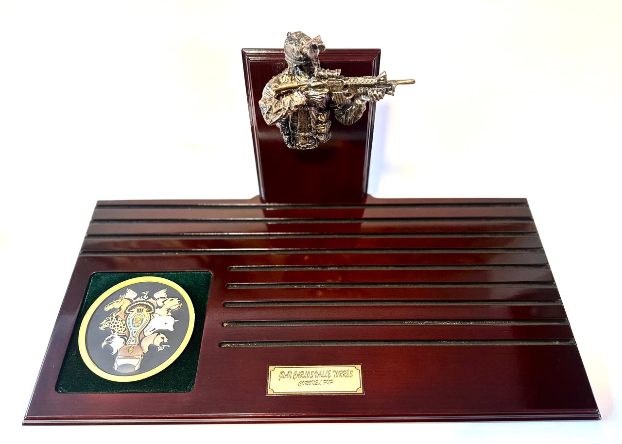 escalera en madera con cubículo Con fondo en terciopelo y escudo Ejército metálico.
